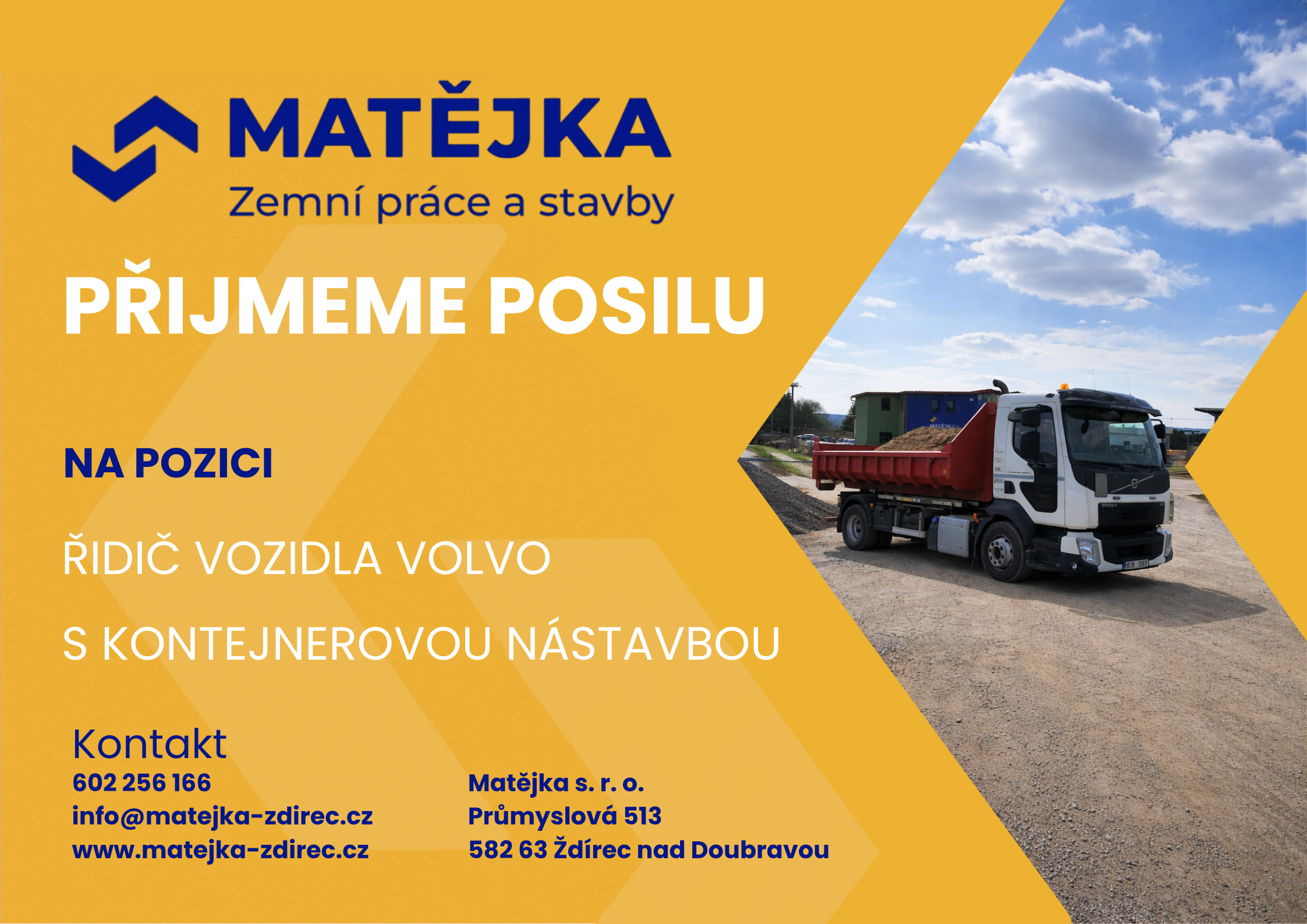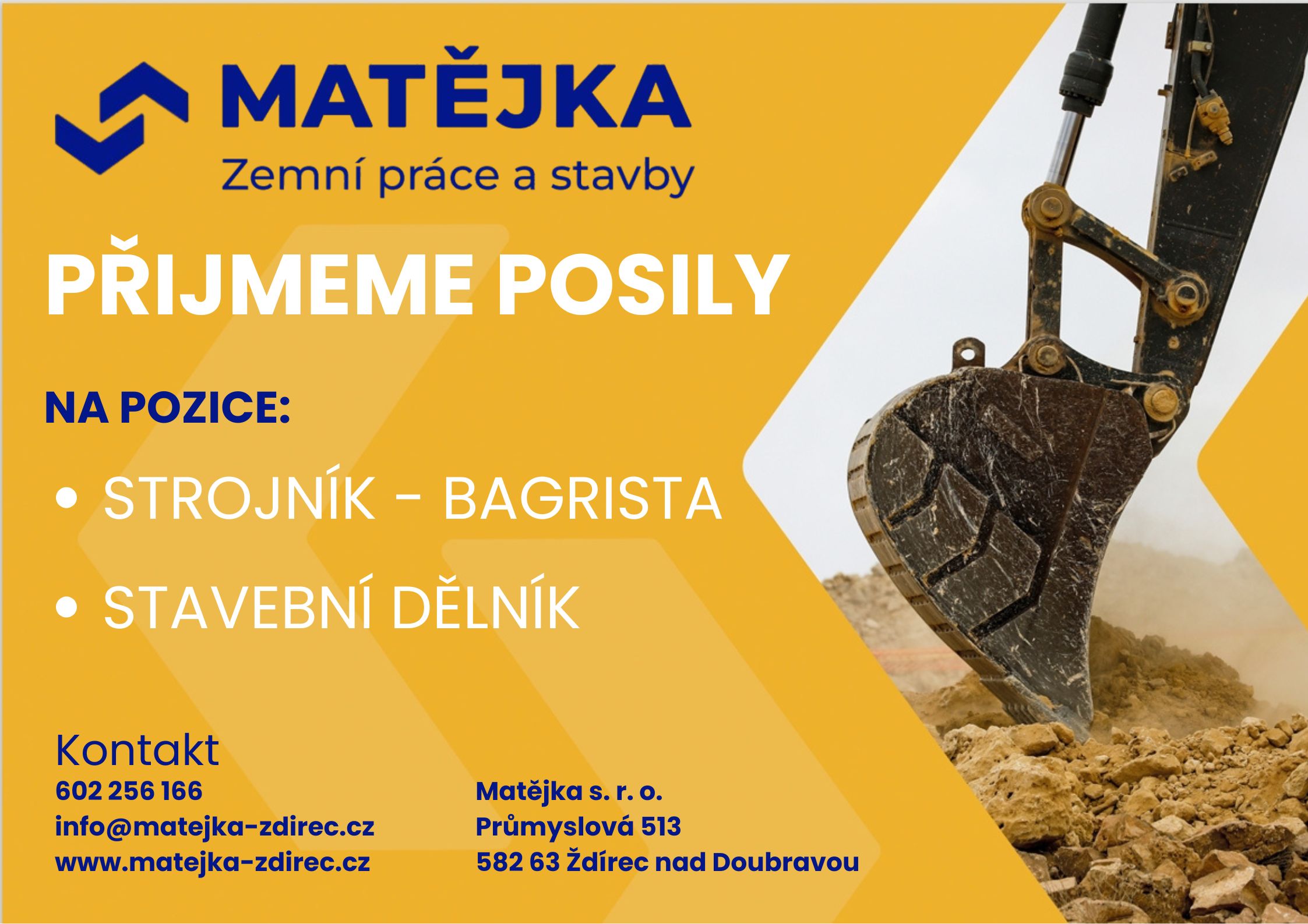 Firma Matějka s. r. o. přijme posily na pozice: bagrista, řidič a stavební dělník