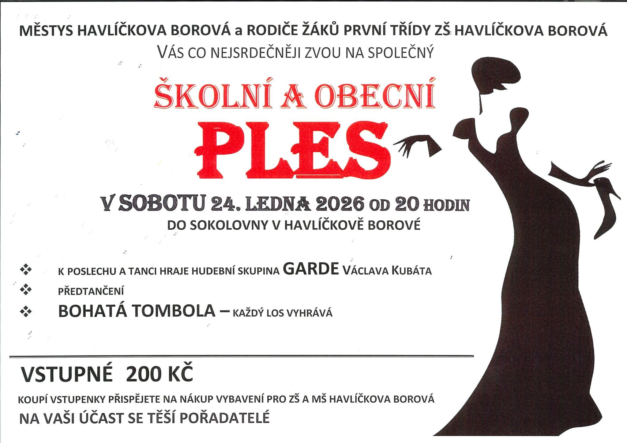 Městys Havlíčkova Borová a rodiče žáků první třídy ZŠ Havlíčkova Borová Vás srdečně zvou na společný ŠKOLNÍ A OBECNÍ PLES, který se bude konat v sobotu 24. ledna 2026 od 20 hodin v sokolovně v Havlíčkově Borové.