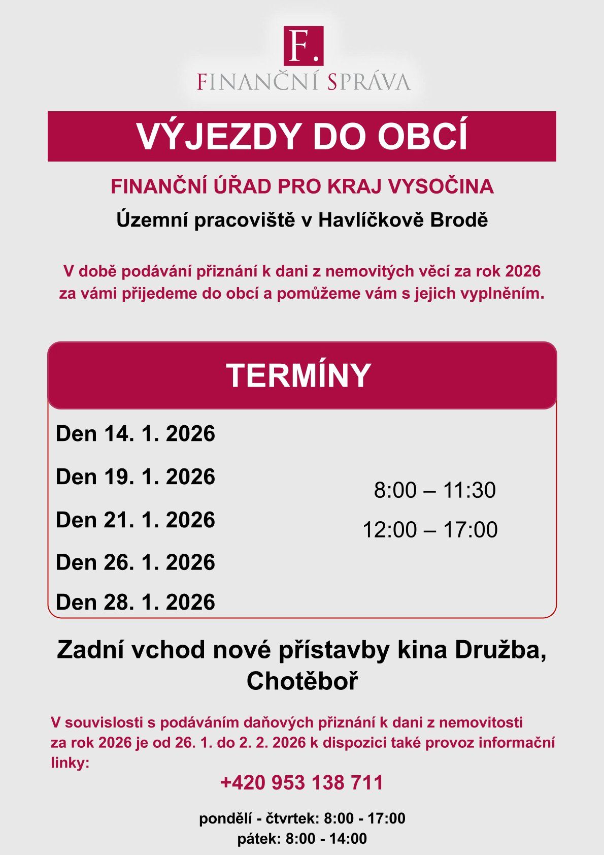 Ve středu 14. ledna se v budově kina v Chotěboři uskuteční první konzultační den Finančního úřadu pro Kraj Vysočina, zaměřený na daň z nemovitostí. Akce probíhá v rámci výjezdů finančního úřadu do obcí a je určena pro občany, kteří potřebují poradit při vyplňování daňového přiznání.