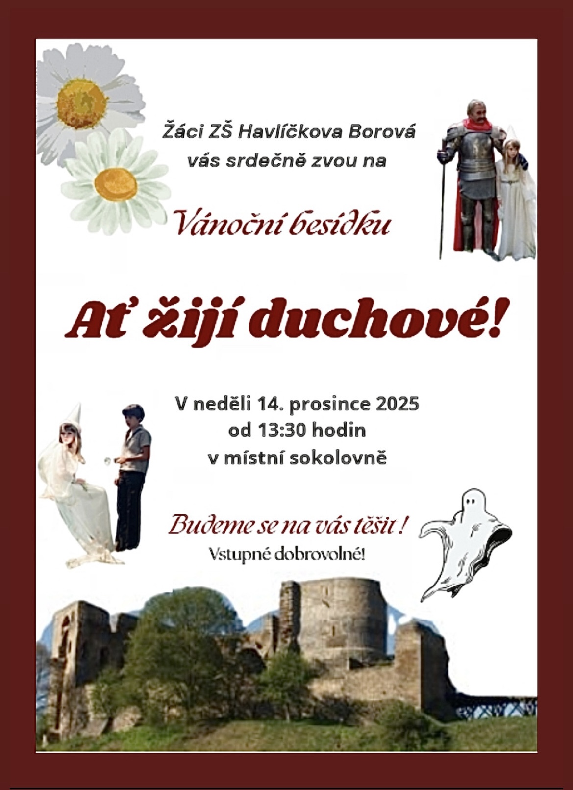 Žáci Základní školy Havlíčkova Borová vás srdečně zvou na VÁNOČNÍ BESÍDKU AŤ ŽIJÍ DUCHOVÉ